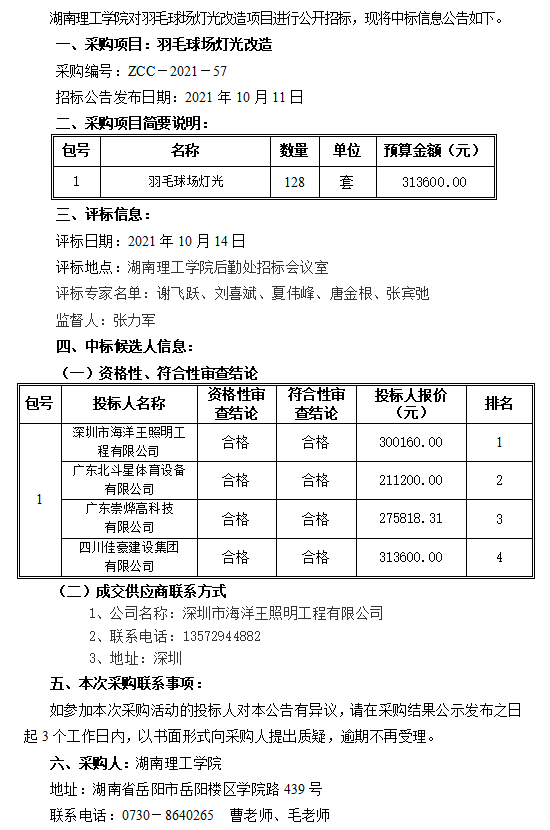 永利皇宫官方网站羽毛球场灯光改造项目中标信息公告