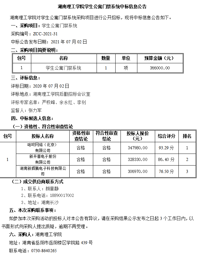 永利皇宫官方网站学生公寓门禁系统中标信息公告
