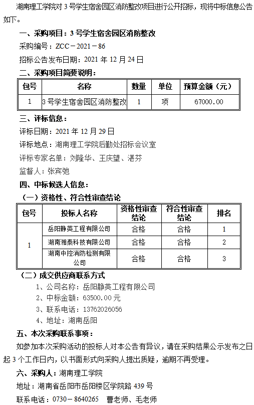 永利皇宫官方网站3号学生宿舍园区消防整改项目中标信息公告
